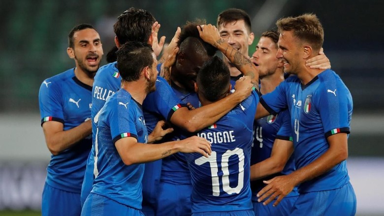 Mario Balotelli merayakan gol pertama Italia ke gawang Arab Saudi bersama rekan-rekannya (Foto: Arnd Wiegmann/Reuters)St. Gallen - Italia meraih kemenangan pada tabrak pertama di masa instruktur Roberto Mancini. Gli Azzurri menang tipis 2-1 atas kontestan Piala Dunia 2018, Arab Saudi.
